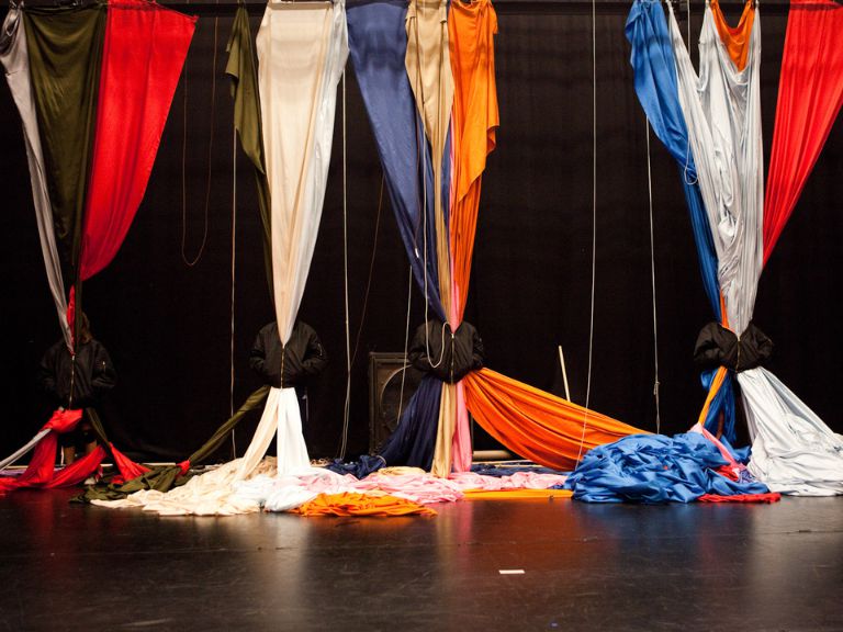 Nach Hamburg kommt Miet Warlop nun mit ihrer neusten Arbeit, einer Ode an die Fantasie und die Kunst mit sechs Performer:innen und drei Kilometern Stoff. Wer die Arbeit von Warlop beschreibt, stößt auf Geheimnisse, die sich kaum in Worte fassen lassen. Aus dem Nichts entstehen Berge und Landschaften, farbenfroh und von Bühnenstürmen bewegt wickeln sich Tücher um Körper, mal brutal, mal liebevoll. So schafft Warlop überwältigende Bilder, die den inneren Aufruhr ihres kreativen Schaffensprozesses wiedergeben und nichts weniger sind als ein kathartisches Reinigungsritual für das Medium Theater.