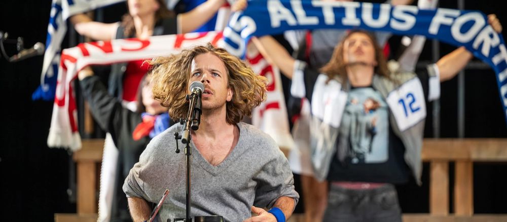 Eine Tribüne, ein Spielfeld, ein Team. Fanschals mit symbolischen Slogans und eine Geigerin auf dem Schwebebalken. Ein männlicher Cheerleader, ganz in Weiß gekleidet, und in Rot eine Schiedsrichterin am Megafon. Ein Sänger auf dem Laufband, begleitet von einem Schlagzeuger, der überall auftaucht. Dazu Flaggen und ein Lied, das die Stimmung immer weiter anheizt: In „One Song: Histoire(s) du Théâtre IV“ wagt Miet Warlop den Spagat zwischen Sport, Wettkampf und Rockkonzert. Die 15 Performer:innen steigern sich in eine Art Trance, bis zur völligen Verausgabung. Wie eine Glaubensgemeinschaft in Ekstase scharen sie sich um ein Lied, das sinnstiftend den Geist ihrer Community verkörpert. Die Performer:innen laufen und singen, skandieren, musizieren und hüpfen – immer schneller, immer furioser – wie in einer Introspektion unserer aktuellen öffentlichen Rituale.